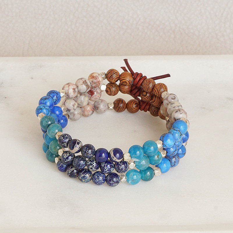 • Gemstones: 6mm Denim Magnesite, Fossil Crinoid, Apatite, and Sea Sediment Jasper