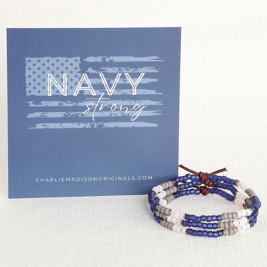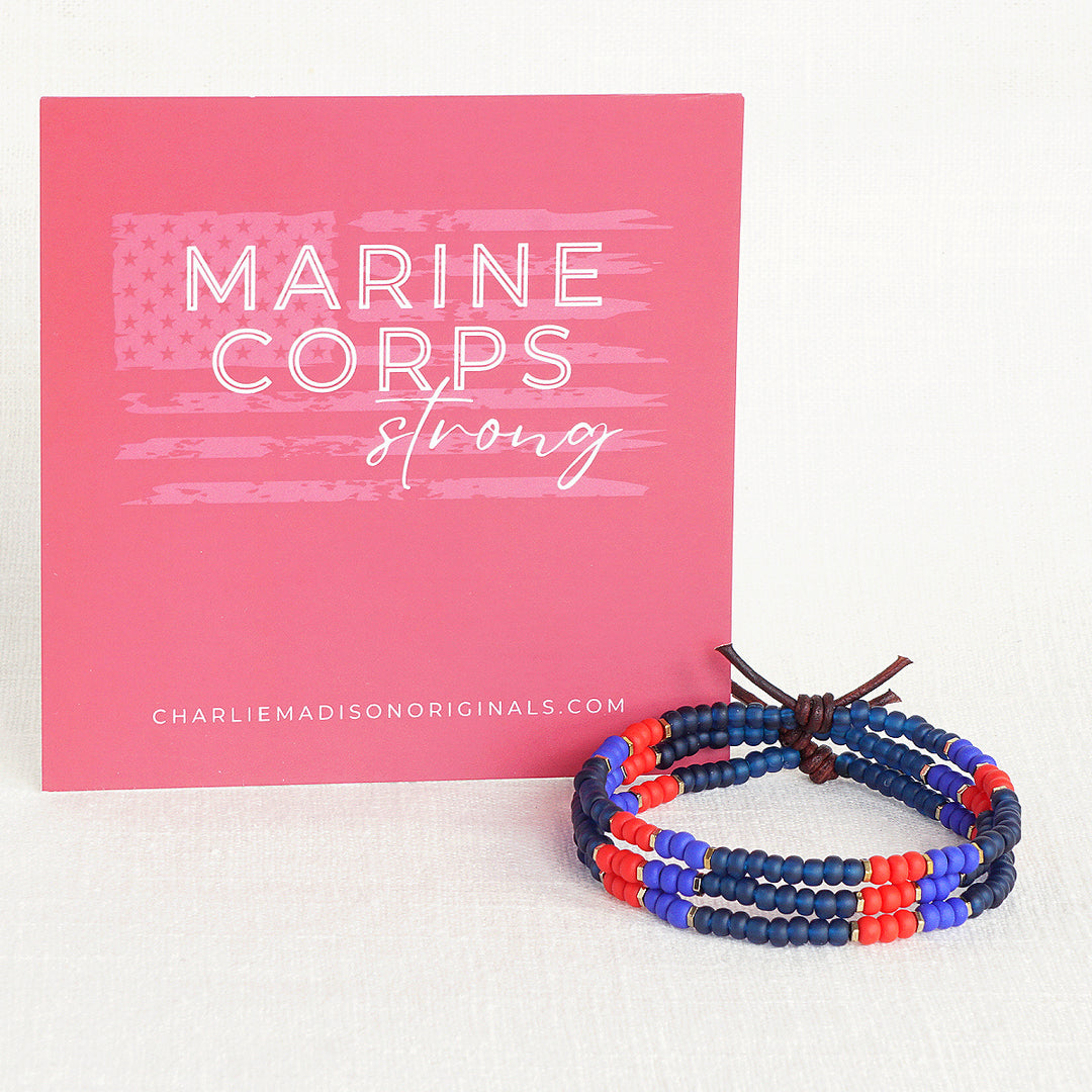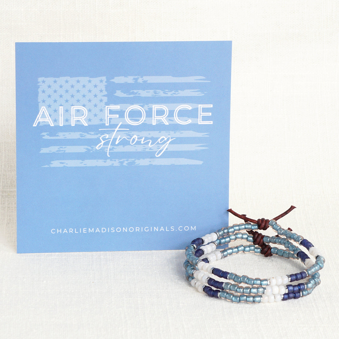 Show your branch pride with the Military Branch Strong Collection. Made with glass seed beads in colors that are inspired by each branch of the military - they are light on your wrist, easily stackable, and make the perfect gift for family, military spouses and moms, or for the next Army-Navy game. Choose from Air Force, Army, Coast Guard, Marine Corps, Navy, and Space Force.