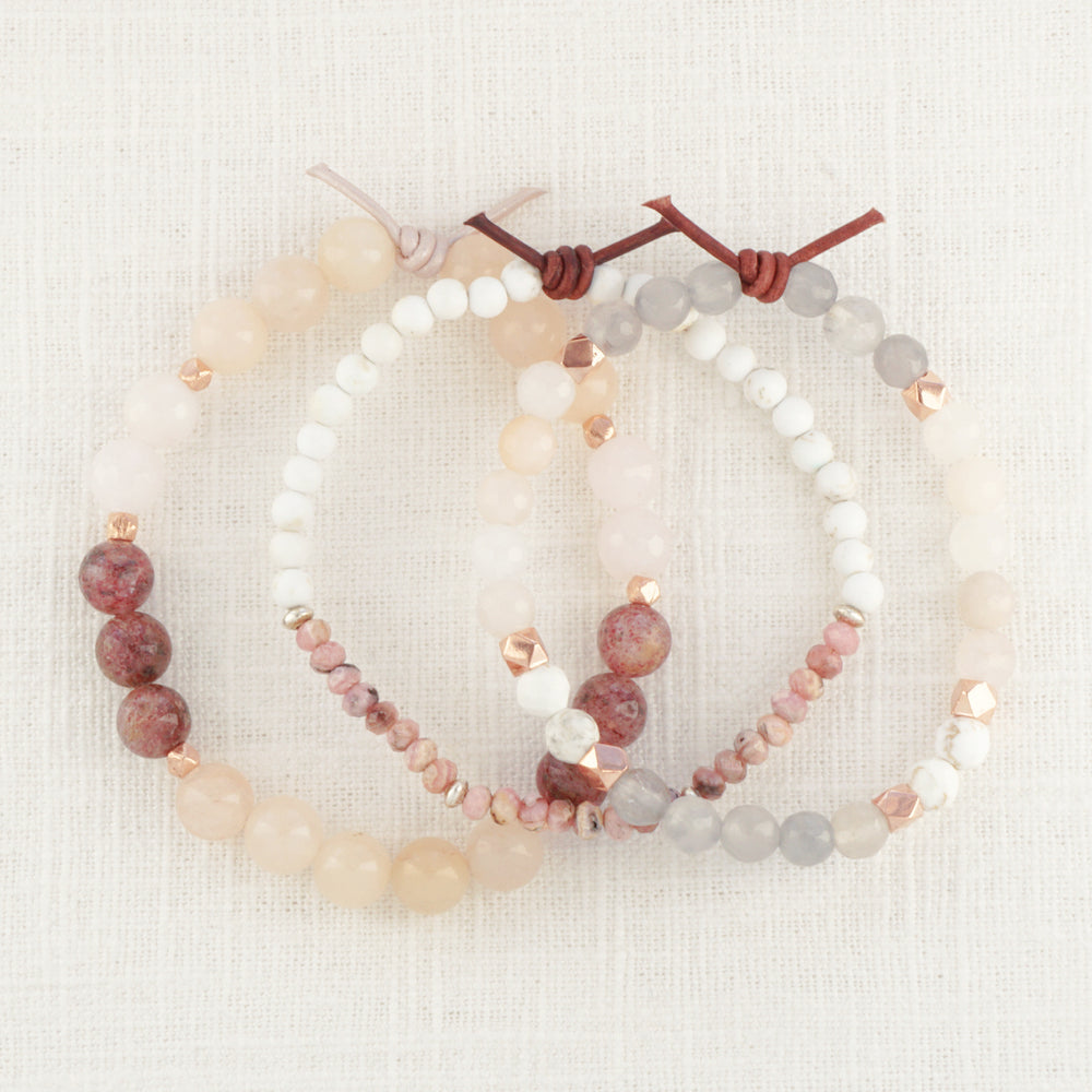 Let Your Light Shine Stack | This set of three bracelets includes the Be Unapologetically You Mini Bracelet in Blush, the Dream Big Tiny Stacker in Rhodocrosite, and the Women Who Do Wonders Bracelet.