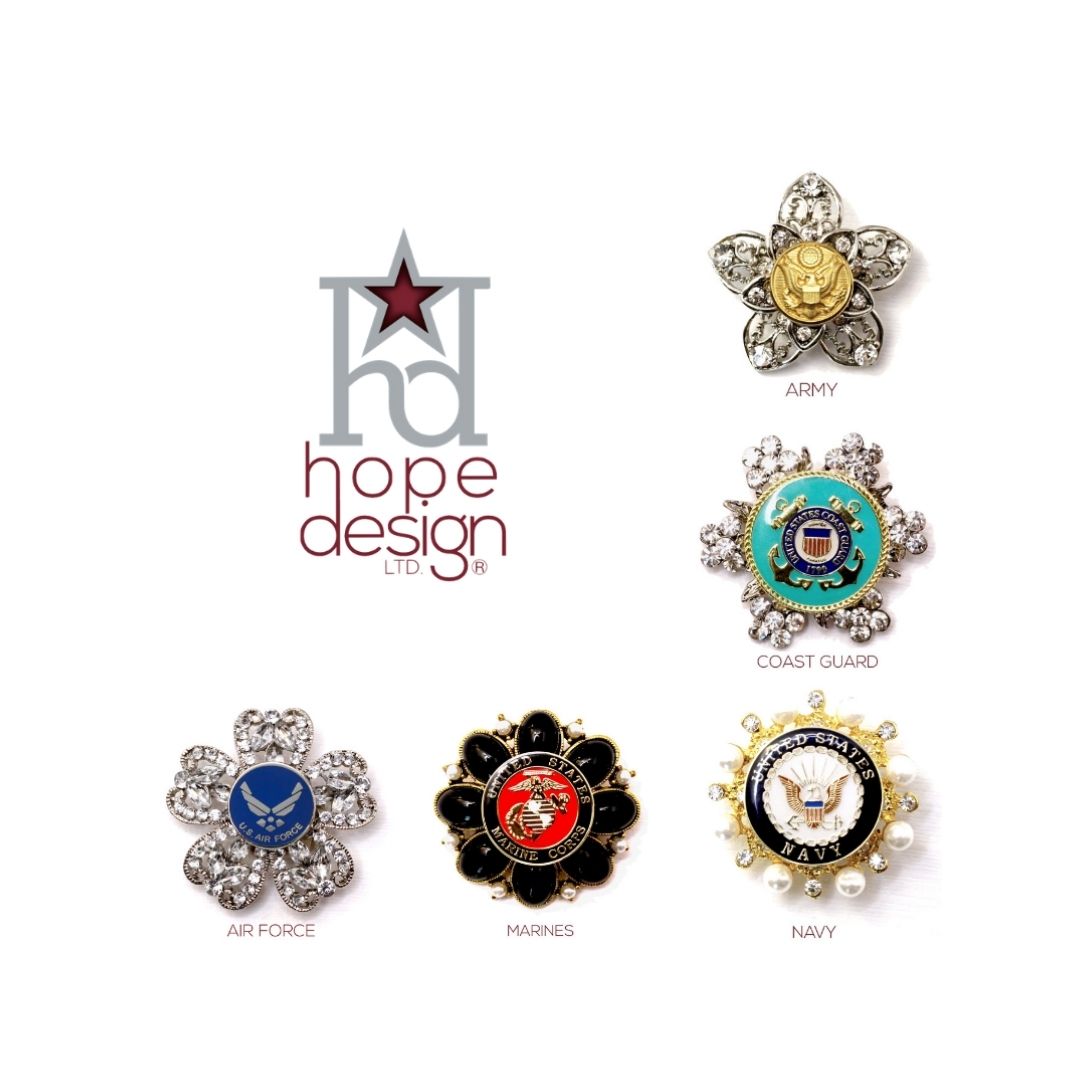 Lauren Hope, military spouse and mastermind behind Hope Design Ltd. handcrafts military jewelry and accessories to honor our country’s service veterans and heroes. From brooches to bracelets, earrings, pins, and more, each piece is truly something special and unique.